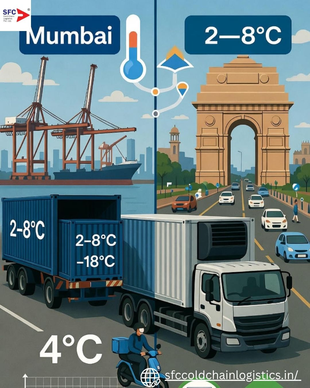 3. What’s the cost of cold chain transport from Mumbai to Delhi? ₹65–90 per kg for 2–8°C, ₹90–120 for –18°C (Nov 2025 rates). Includes monitoring, insurance, and last-mile.